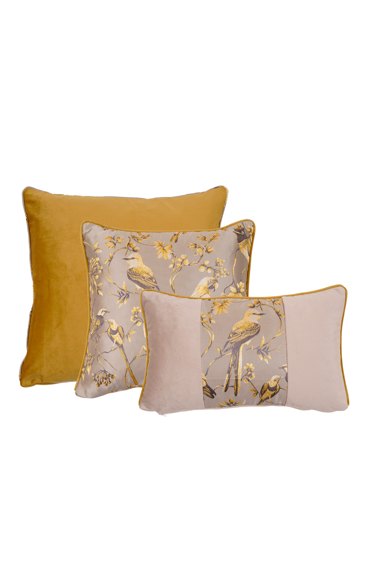 - Zarif Kuş Desenleri: Yastıklardaki detaylı kuş ve çiçek dalı çizimleri, dekorasyonunuza sanatsal ve romantik bir dokunuş yapar.